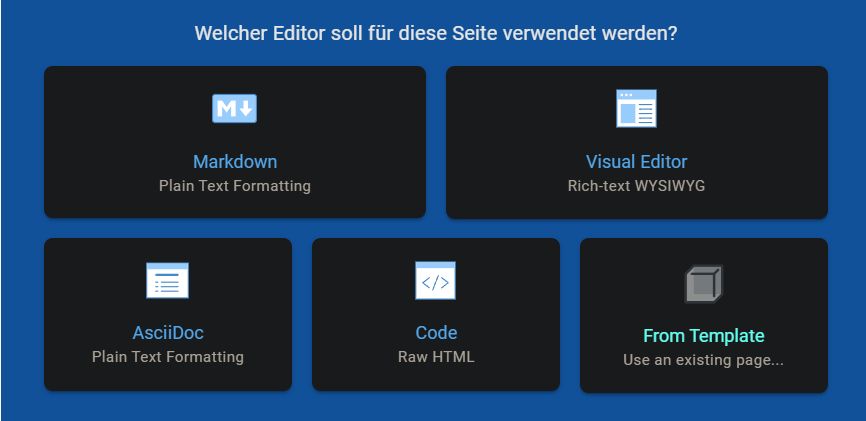 Hier kann ganz nach Belieben ein Editor gewählt werden. Einzig bei Seiten, die automatisch übersetzt werden sollen, muss die Erstellung in Code (Raw HTML) oder Visual Editor erfolgen.