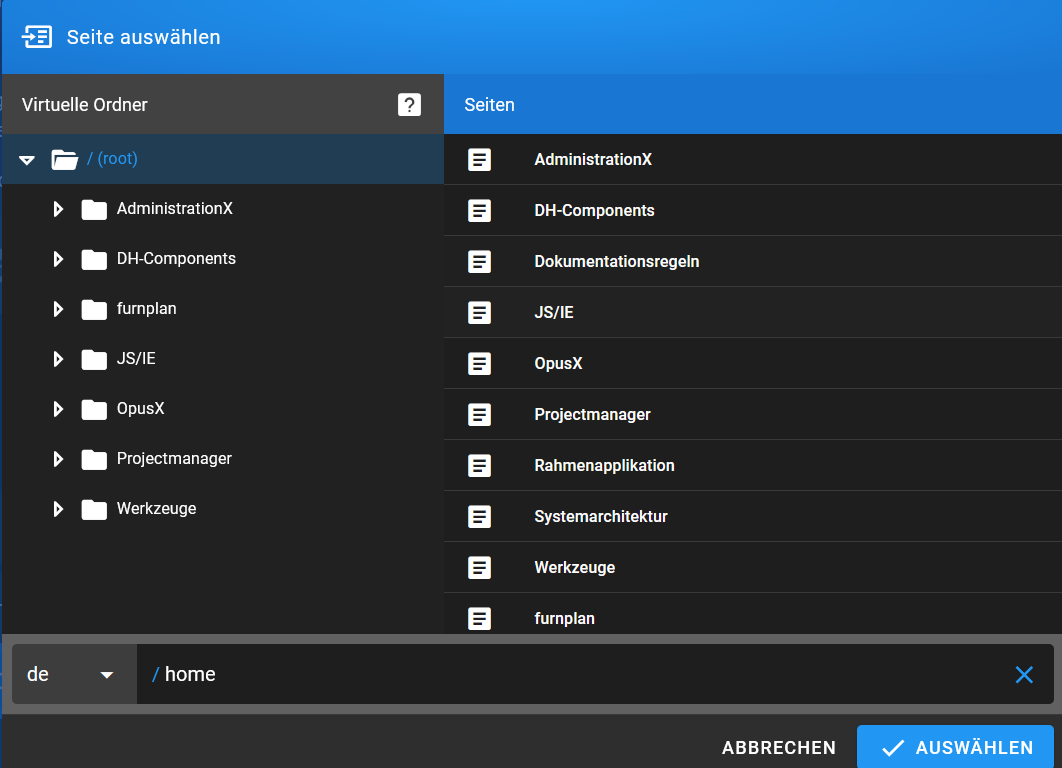 Wenn der Button für den internen Link angeklickt wird, öffnet sich als erstes ein Fenster, dass es erlaubt die zu verlinkende Seite auszuwählen.