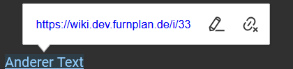 Wer auf einen bestimmten Anker auf der verlinkten Seite verweisen möchte, kann dies tun indem am Ende der URL noch #ANKENAME hinzugefügt wird. Als Beispiel: https://wiki.dev.furnplan.de/i/56#example